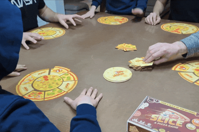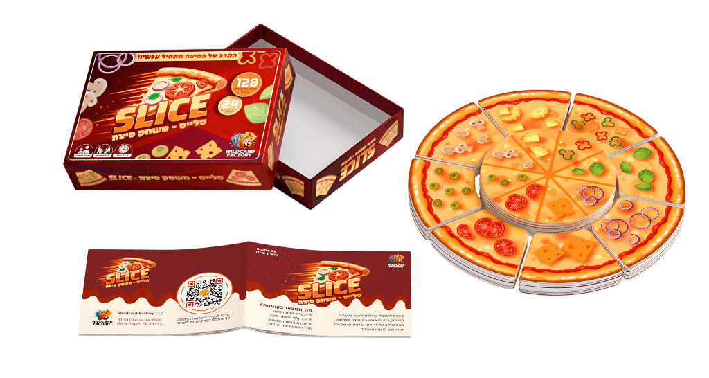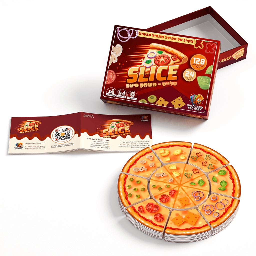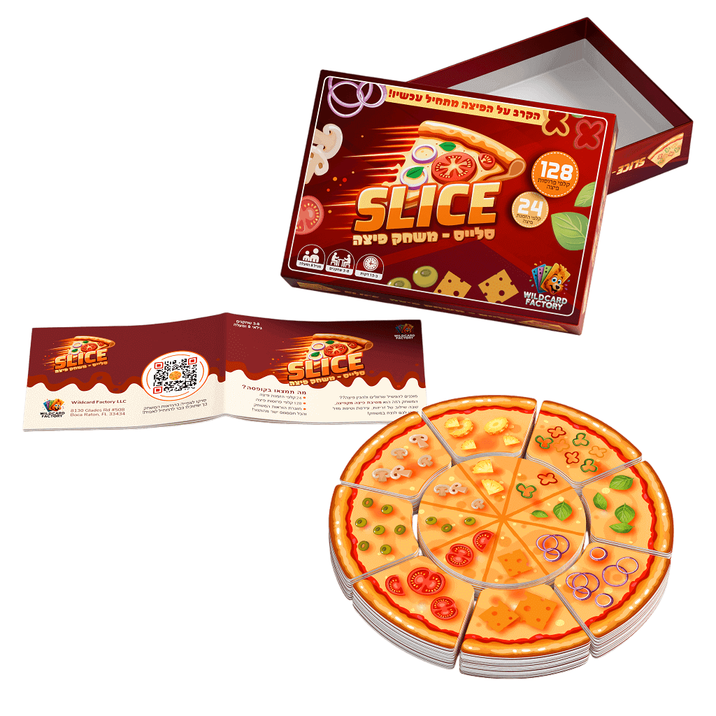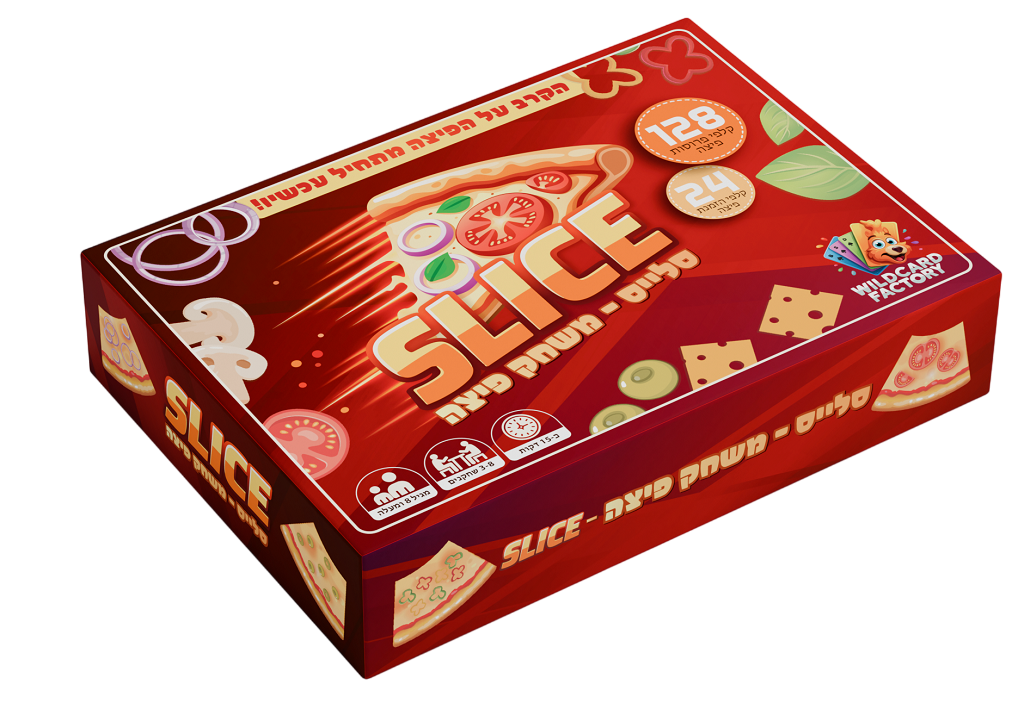 'סלייס – משחק פיצה' הוא משחק קלפים קצבי ומלא אנרגיה שבו השחקנים מתחרים על תפיסת פרוסות הפיצה המתאימות כדי להשלים את הזמנת הפיצה שלהם לפני כולם.